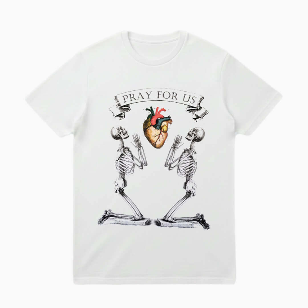 Destaque: Estampa "Pray For Us" com alta riqueza de detalhes anatômicos.