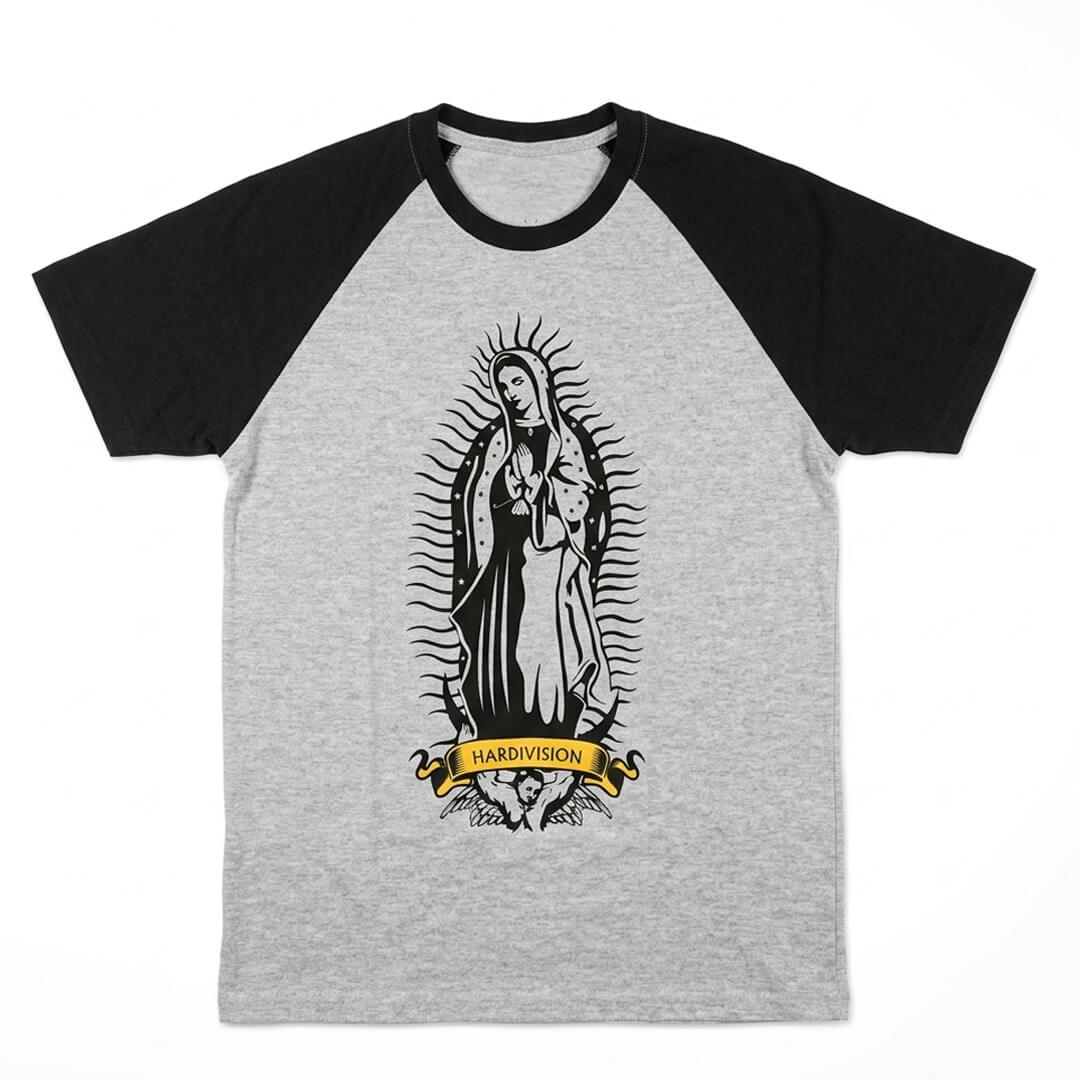 A Camiseta Guadalupe da Hardvision une a tradição religiosa à estética urbana das ruas. Com uma estampa detalhada da padroeira em traços clássicos, complementada por uma faixa amarela com a assinatura da marca, esta peça é um símbolo de identidade e atitude. A combinação de cores cinza e preto na modelagem Raglan oferece um visual moderno e dinâmico, ideal para quem busca originalidade.